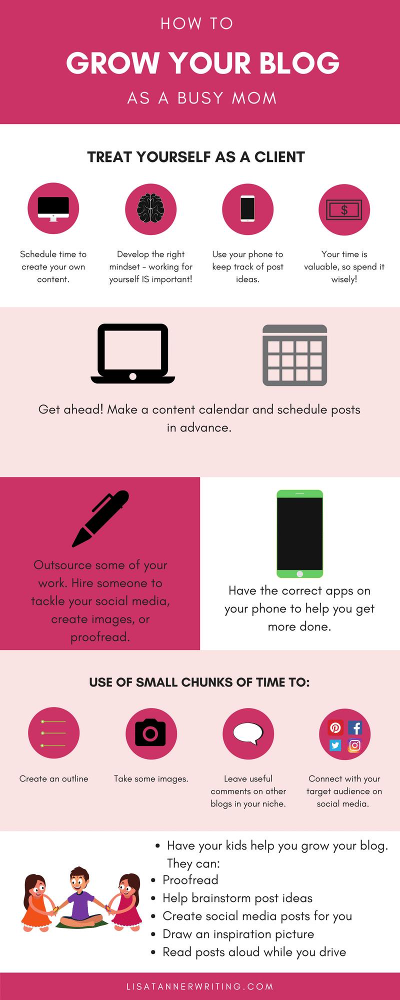 Excellent tips Lisa! I have been thinking about enlisting my 12-year-old to help me with finding and creating graphics – she’s very creative and it would help me at the same time. I think I also need to consider just trying for one post/week and scheduling the 2nd one out (if I have time for it). Any more than that is probably a lofty goal and it gets depressing when I feel like I’m always behind! Thanks for sharing your wisdom here. ๐
