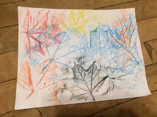 When you come back in, get your kids set up with crayons (paper removed), and paper. Show them how to make a leaf rubbing, and then sit nearby and work on your post while they make more.
