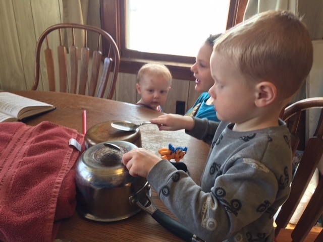 My oldest plays the recorder for us. The other kids asked if they could play an instrument today too. I said yes. They created some interesting ones, including pots and pans with a spoon and banging lids together.